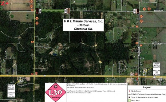 Chestnut Road between Chance and Barrineau Park roads will be closed to thru traffic beginning Thursday, Nov. 16, while construction crews perform structural work to the Chestnut Road Bridge. During this time, traffic will be detoured along Highway 29 from Barrineau Park Road to Chance Road in both directions. Chestnut Road is expected to re-open by December 2023.