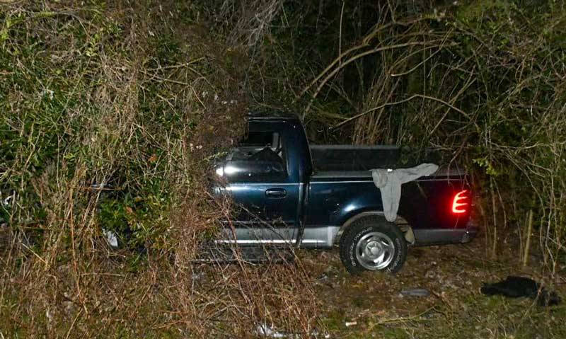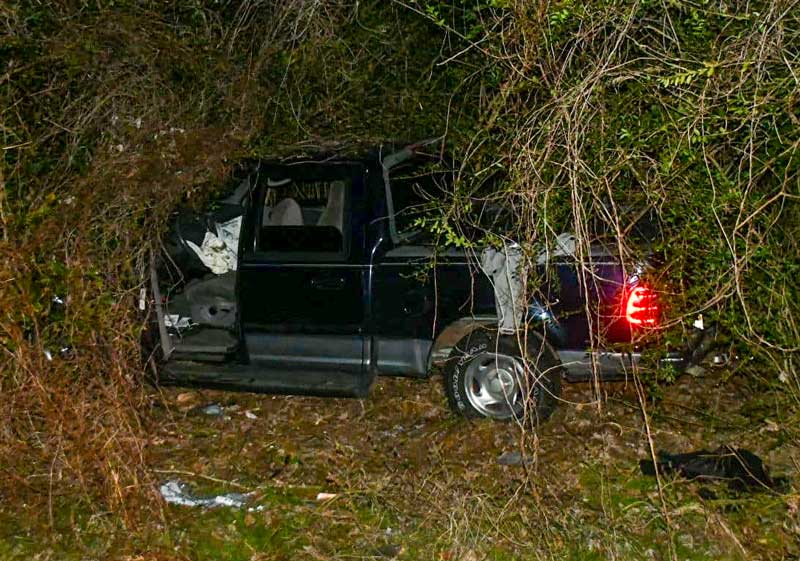 The crash was reported about 6:45 p.m. near the intersection of Jacks Branch Road and Highway 196. A pickup truck left the roadway and came to rest in the wood line.