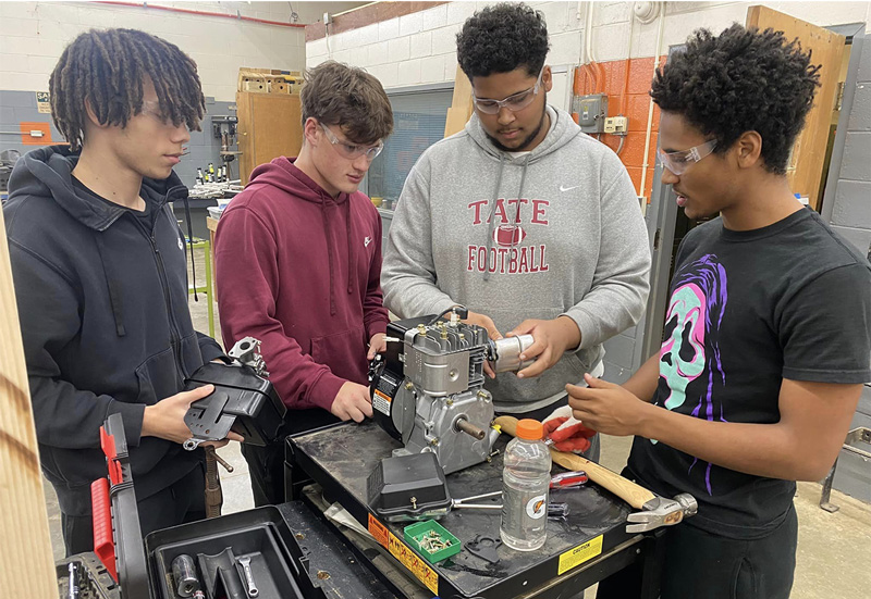 Pictured: Students in Tate’s Agricultural Mechanics program are working on small engines. This module provides technical applications of using small gas engines. Students are learning practical skills in measurements, troubleshooting, documenting an engine tear down and assembly, completing work/repair orders, and reading service manuals and schematics. Photos for NorthEscambia.com, click to enlarge.