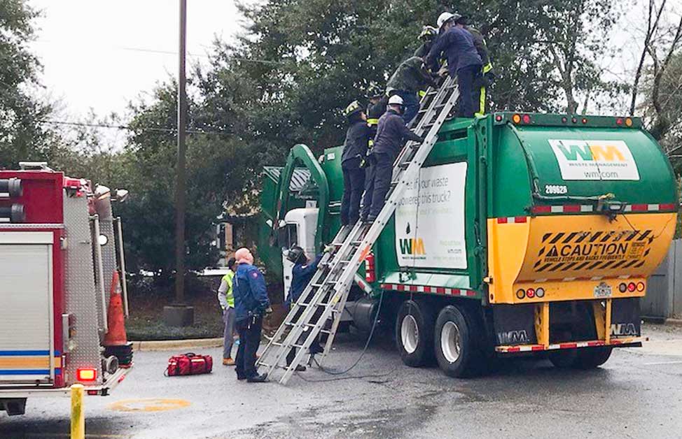 Escambia County Fire Rescue. said “a person was launched into the garbage truck and trapped inside.”