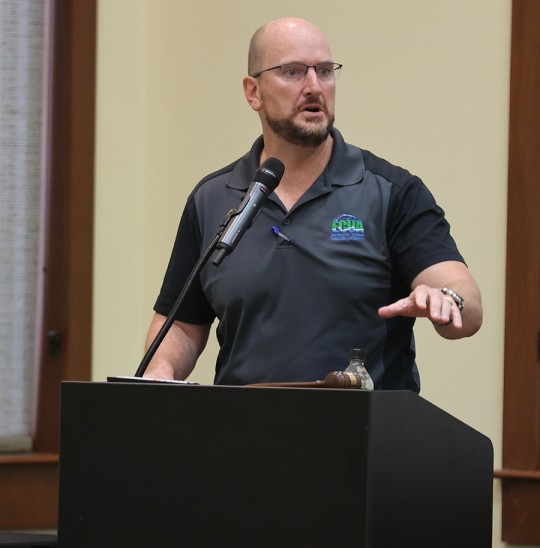 Pictured: ECUA District 5 board member Kevin Stephens speaks during a 2023 town hall in Cantonment hosted by District 5 Commissioner Steven Barry. NorthEscambia.com photo, click to enlarge.