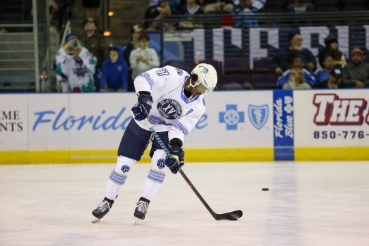 The Ice Flyers’ Malik Johnson skated back to center ice, after chosen as the game’s No. 1 star, tapping his heart to acknowledge the supportive crowd.