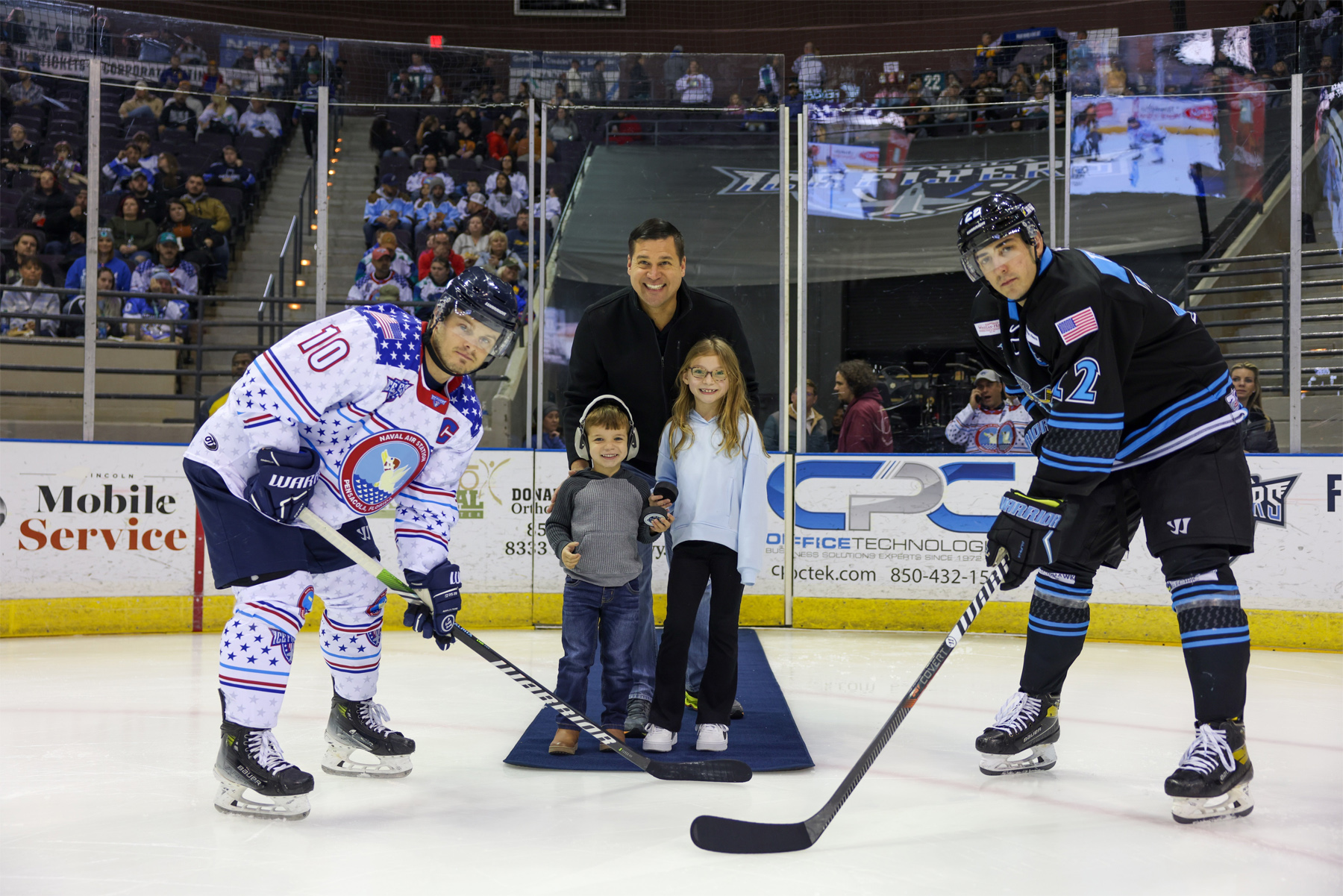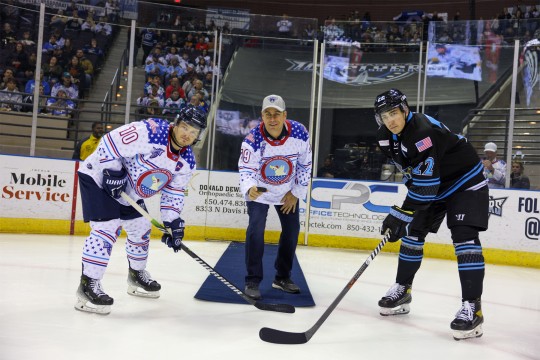 Capt. Terrence Shashaty, Commanding Officer of NAS Pensacola, was honored before the game with the ceremonial puck drop. Shashaty also got the crowd going at the second intermission by using the “Gatlin Gun” to send soft stress balls into the stands.