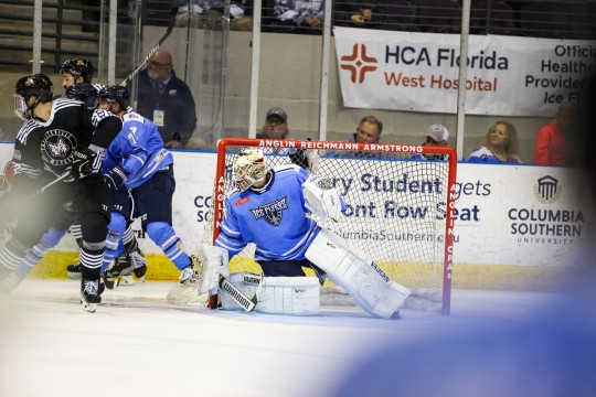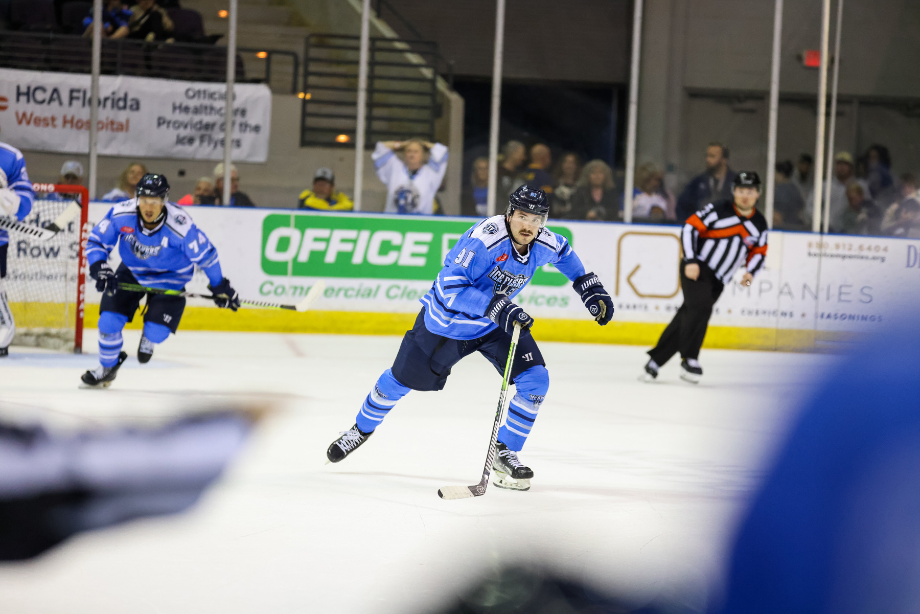 — Before the game, Ice Flyers’ long time radio broadcaster Paul Chestnutt was welcomed into the team’s locker room by invitation from Gary Graham to read the starting lineup and speak to the team. He received a loud cheer by the players for his recent induction into the Pensacola Sports Hall of Fame. Chestnutt was also honored by the Ice Flyers on the video board during a timeout in the second period, eliciting a loud applause from the crowd.