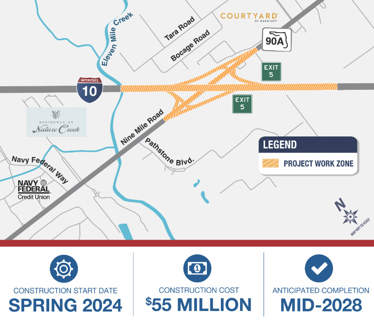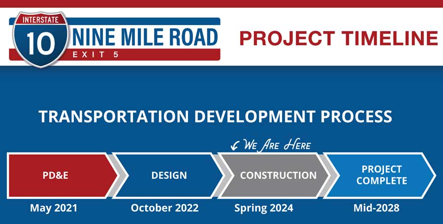Planned improvements include replacing the existing I-10 overpass at Nine Mile Road to increase vertical clearance and to accommodate future improvements. The project will enhance traffic safety and mobility for the 62,000 drivers who travel the interchange daily.