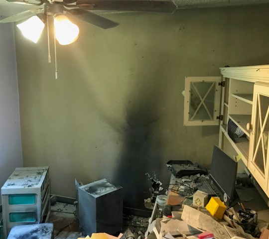 Firefighters arrived to find light smoke from the front door of the single-story home. A resident reported they heard a loud pop and discovered a small fire in the office. The resident was able to stop fire progression with a fire extinguisher, and ECFR was able to remove smoke from inside the home. The occupants were not displaced or injured.