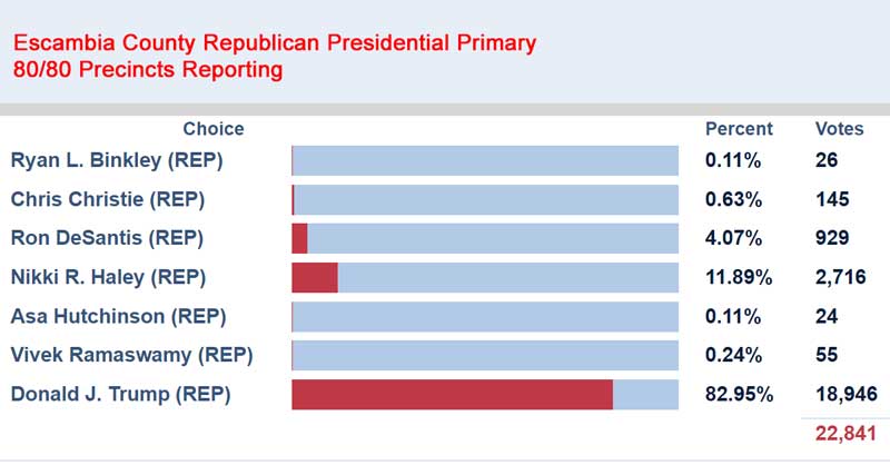 In Escambia County, Nikki Haley received 11.89%, and DeSantis garnered 4.07%. Both dropped out of the race but remained on the ballot. Under Florida law, a vote cast for any candidate nominee appearing on the ballot still counts as a vote for that candidate.
