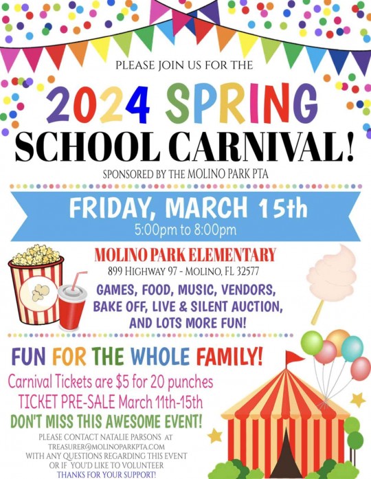 The Molino Park Elementary School 2024 Spring Carnival will be held Friday from 5-8 p.m. at the school.