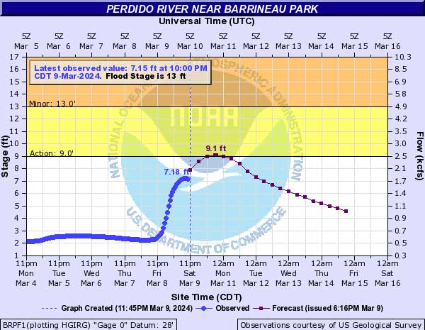 The Perdido River near Barrineau Park is expected to crest at 9.1 feet on Monday, just above action stage of 9.0 feet. Minor flood stage for the Perdido River is 13 feet. Saturday night, the stage was at 7.18 feet.