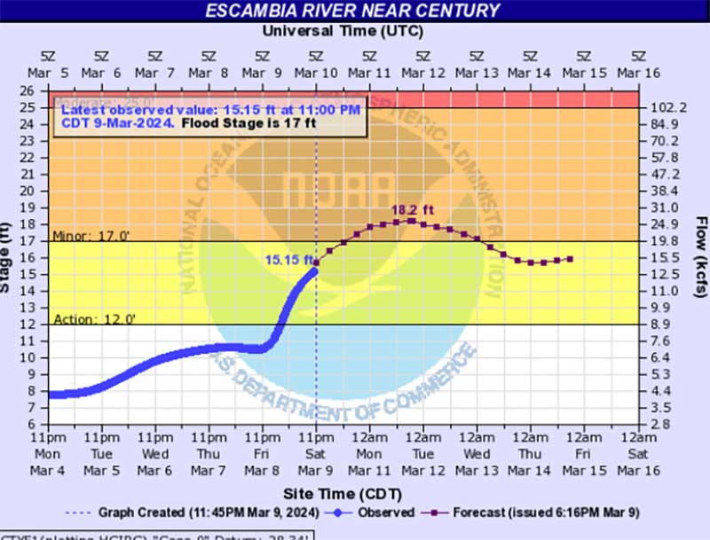 A flood warning is in effect for the Escambia River near Century until Wednesday morning. Minor flooding is forecast.