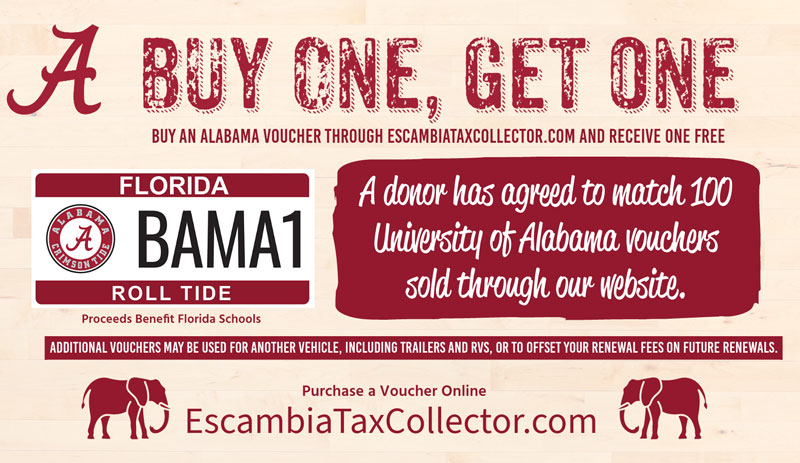 University of Alabama tag vouchers are buy one, get one free for the first 100 purchasers in Escambia County.