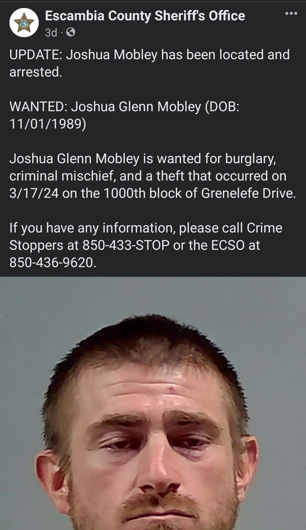 In a Facebook post Wednesday, the Escambia County Sheriff’s Office asked for the public’s help to find Mobley and said he was wanted for a March 17 burglary in the 1000 block of Grenelefe Drive near McKenzie and Handy roads in Cottage Hill.