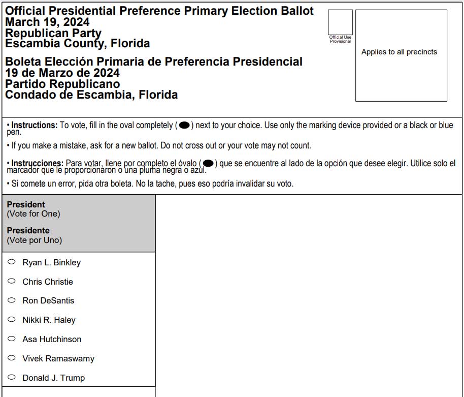 Pictured: A sample Escambia County Presidential Preference Primary ballot. NorthEscambia.com image.