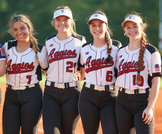 Pictured: Tate Lady Aggies softball seniors (L-R) #7 Kate Balagbagan, #21 Kylea Gibbs, #6 Lizzy McVay and #10 Liv Latner. Also pictured: Game action Friday afternoon as Tate hosted Escambia at Tate. NorthEscambia.com photos, click to enlarge.