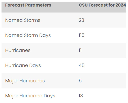 Given the combined hurricane-favorable signals of an extremely warm Atlantic and a likely developing La Niña, the forecast team has higher-than-normal confidence for an April outlook that the 2024 Atlantic hurricane season will be very active. This is the highest prediction for hurricanes that CSU has ever issued with their April outlook.