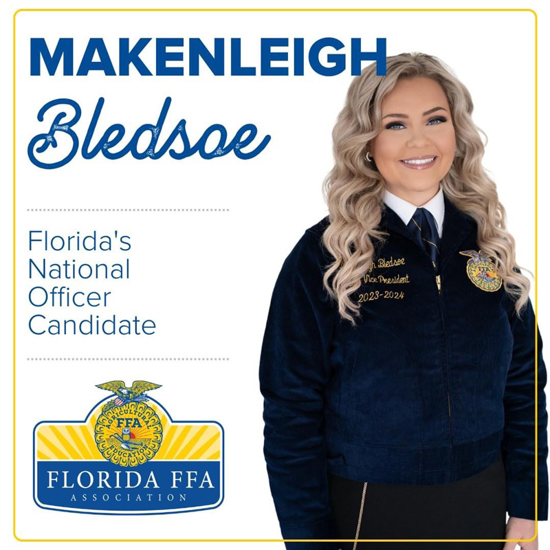 Makenleigh Bledsoe, a 2023 JHS graduate and 2023-2024 Florida FFA state vice president, was selected recently to represent Florida as a 2024 national FFA candidate.