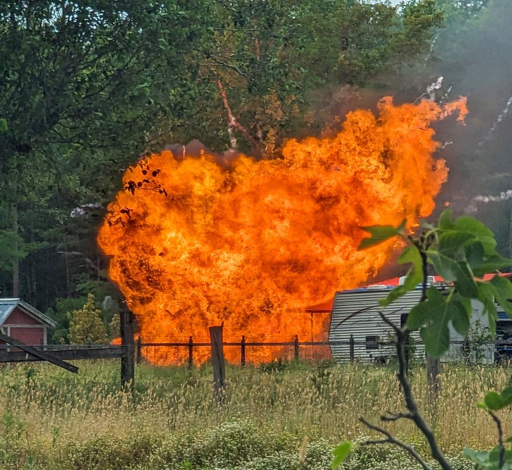 The fire in the small shed was reportedly sparked by an accidental yard fire that spread. At least two propane tanks exploded, rattling the park and neighborhood.