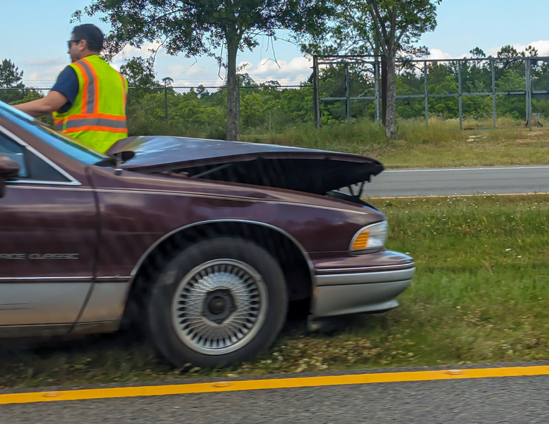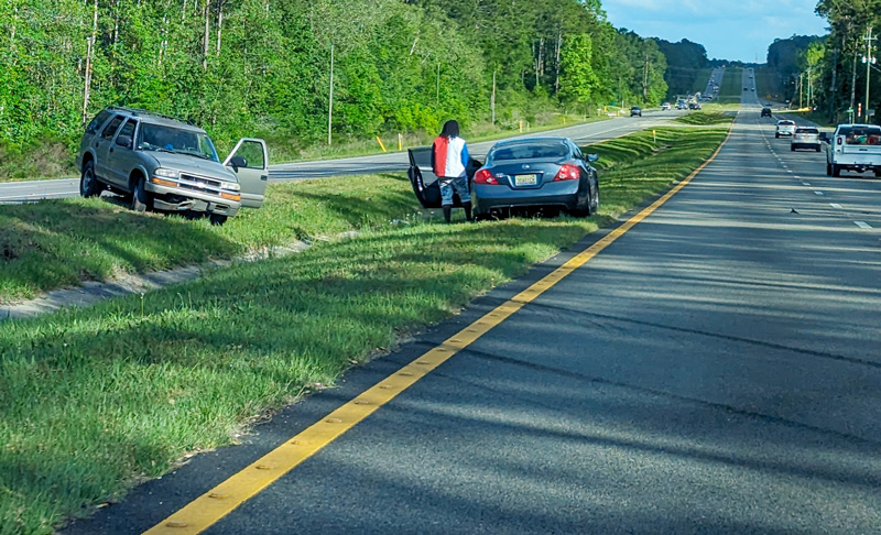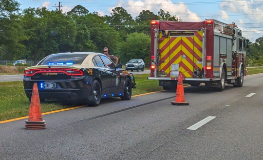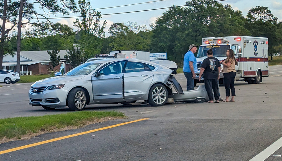 The first crash (pictured above and two photos below) happened about 4:33 p.m. on Highway 29 at Neal Road when a Chevrolet Sedan and an older model Chevrolet Caprice collided. The Caprice came to a stop about 500 south of the intersection, slowing southbound traffic. Two people were transported by Escambia County with non-life-threatening injuries.