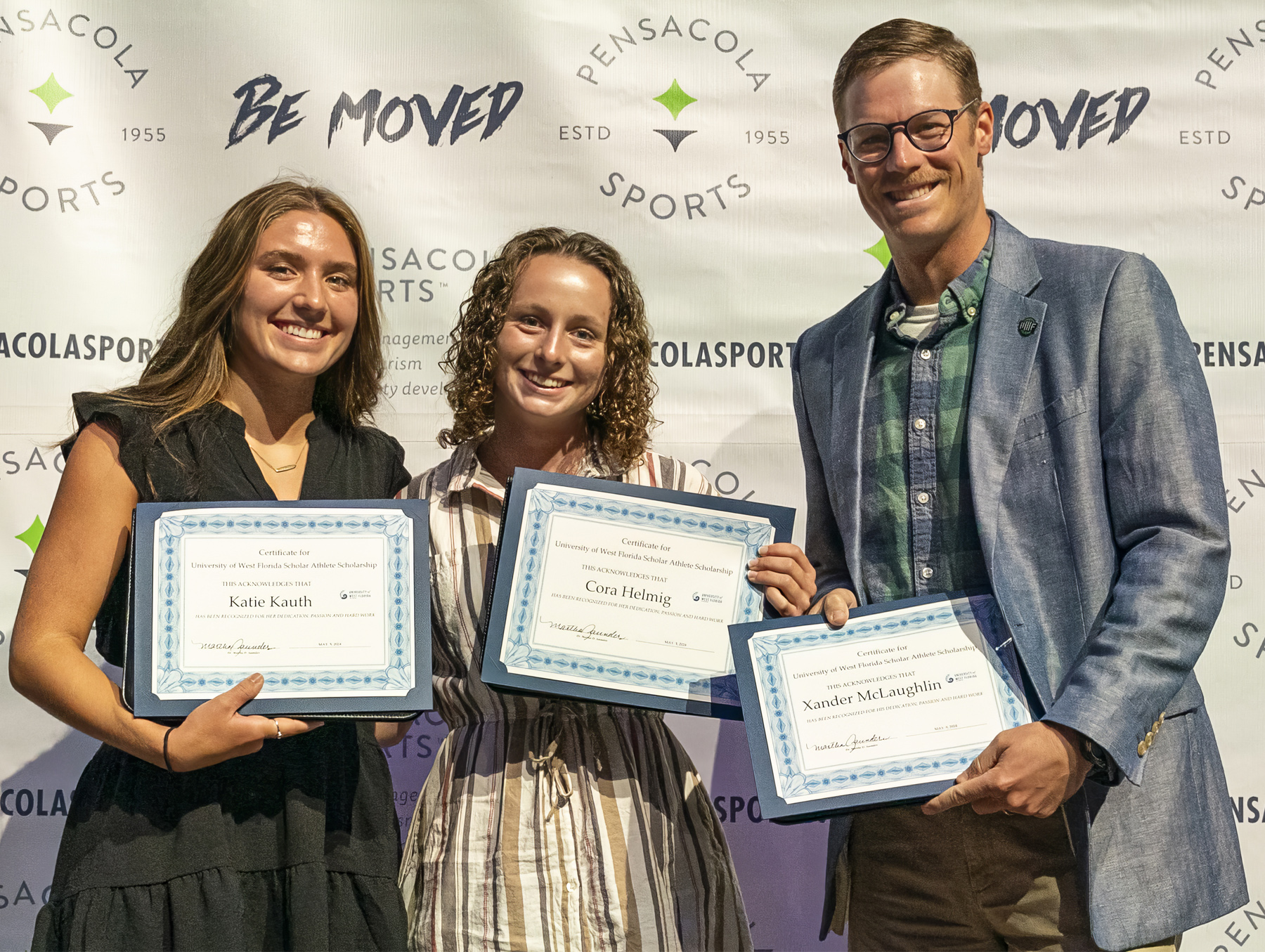 Pictured top: Overall female Gabrielle Goyins – Catholic High. Pictured below: Overall male Christopher Rembert – Catholic High. Pictured below: Baseball winner Bray Touchstone – Tate High School. Boy’s golf winner Bentley Van Pelt – West Florida. Pictured bottom: UWF Scholarship winners Katie Kauth – Navarre, Cora Helmig – Tate, and Xander McLaughlin – Catholic. Photos courtesy Pensacola Sports for NorthEscambia.com, click to enlarge.