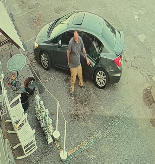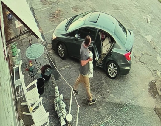 The theft occurred about 7 a.m. May 16 at Antiques Marketplace at 10100 Pensacola Boulevard, just south of 10 Mile Road. Surveillance images shows the man taking items from outside the business and placing them into the backseat of a small car.