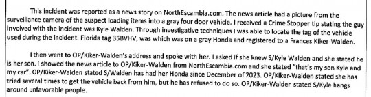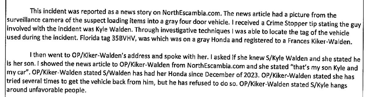 “I then went to OP/Kiker-Walden’s address and spoke with her. I asked if she knew S/Kyle Walden and she stated he is her son. I showed the news article to OP/Kiker-Walden from North Escambia.com and she stated “that’s my son Kyle and my car”. OP/Kiker-Walden stated S/Walden has had her Honda since December of 2023. OP/Kiker-Walden stated she has tried several times to get the vehicle back from him, but he has refused to do so. OP/Kiker-Walden stated S/Kyle hangs around unfavorable people.”