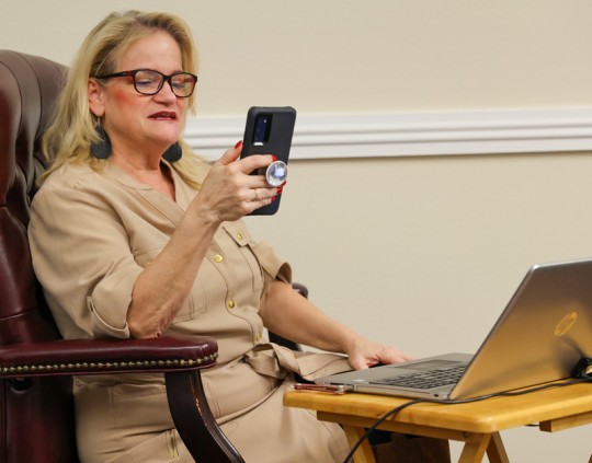 Pictured: Century Town Clerk Leslie Howington uses her phone to find information for council members during a Century Town Council meeting. NorthEscambia.com, click to enlarge.
