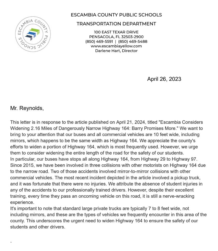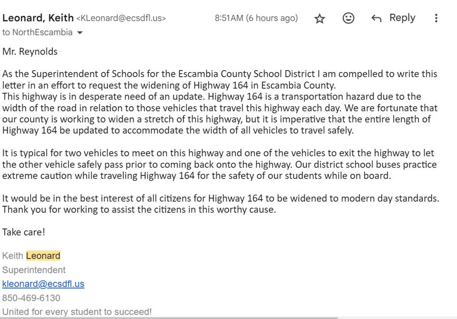 “We are fortunate that our county is working to widen a stretch of this highway, but it is imperative that the entire length of Highway 164 be updated to accommodate the width of all vehicles to travel safely,” Escambia County Schools Superintendent Keith Leonard said in an email to NorthEscambia.com Tuesday. Leonard said a similar letter will be sent to the county.