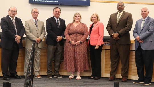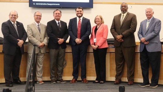 Pictured: Escambia County School Superintendent Keith Leonard and school board members with new administrators Austin Courson (top), Megan Carroll (first below), Melanie McElhaney (second below) and Stephen Brooks (bottom photo). Photos for NorthEscambia.com, click to enlarge.