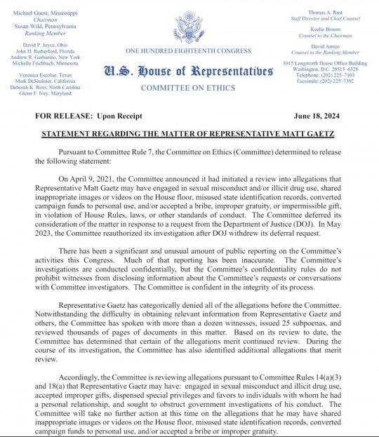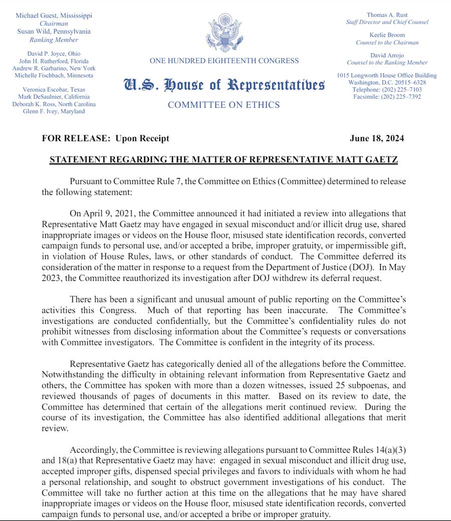 “Accordingly, the Committee is reviewing allegations pursuant to Committee Rules 14(a)(3) and 18(a) that Representative Gaetz may have: engaged in sexual misconduct and illicit drug use, accepted improper gifts, dispensed special privileges and favors to individuals with whom he had a personal relationship, and sought to obstruct government investigations of his conduct. The Committee will take no further action at this time on the allegations that he may have shared inappropriate images or videos on the House floor, misused state identification records, converted campaign funds to personal use, and/or accepted a bribe or improper gratuity.