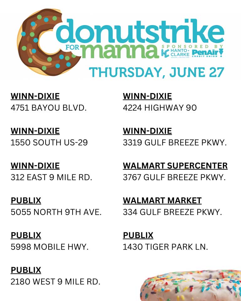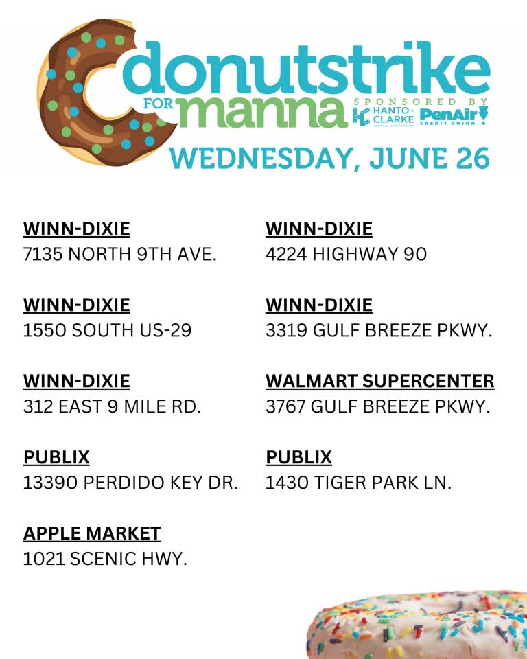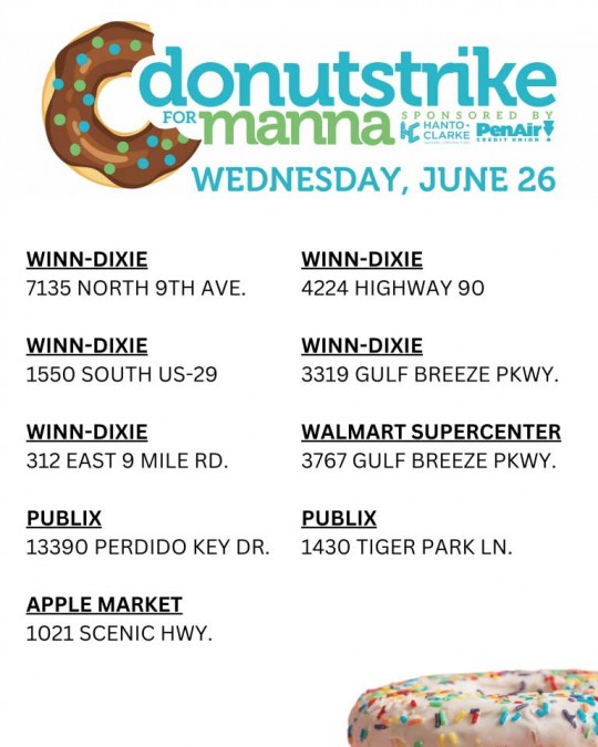 Food donations and financial gifts to Manna may also be dropped off at their headquarters, 3030 North E Street, Pensacola, any day during the week of the Strike, from 9 a.m. to 4 p.m.