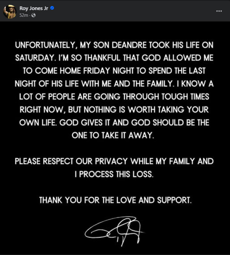 “Unfortunately, my son DeAndre took his life on Saturday. I’m so thankful that God allowed me to come home Friday night to spend the last night of his life with me and the family. I know a lot of people are going through tough times right now, but nothing is worth taking your own life. God gives it and God should be the one to take it away. Please respect our privacy while my family and I process this loss. Thank you for the love and support.”