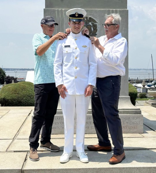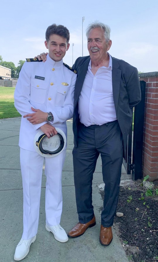 His father, retired U. S. Navy Master Chief Neal Johnson and his grandfather, U. S. Army veteran Ken Moore placed his ensign shoulder boards during the commissioning ceremony.