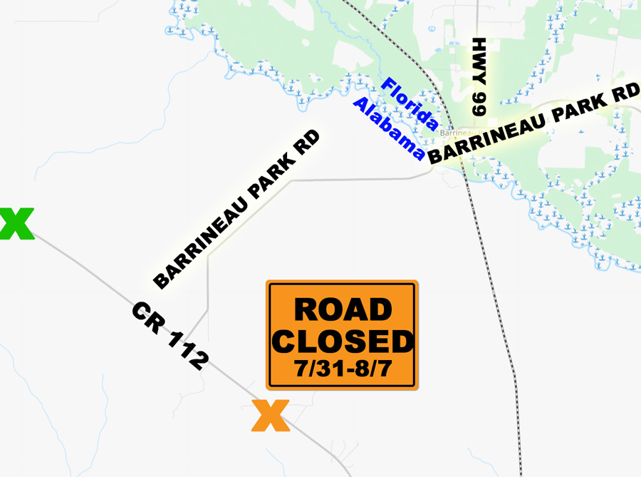 Baldwin County Road 112 will be closed southeast of Barrineau Park Road at Patience Lane (toward Muscogee Road in Florida) from until August 7, with no detour for drivers coming from or traveling to Barrineau Park Road in Florida.