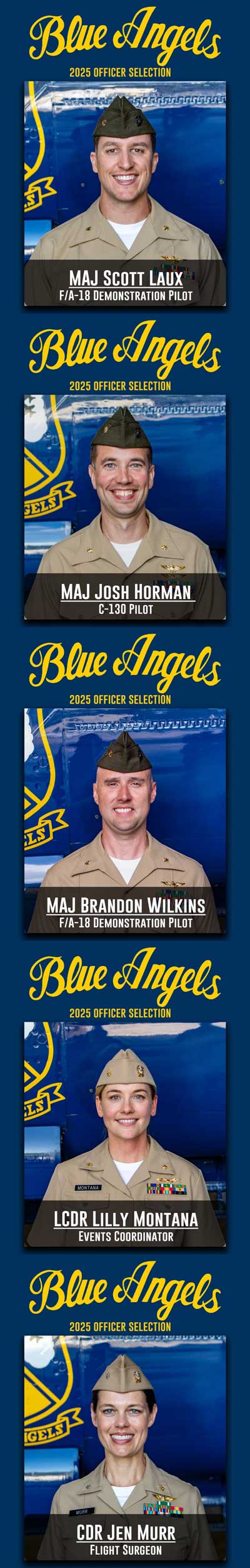 “It’s always a challenge selecting new officers for the team because we have so many highly qualified applicants,” said Cdr. Alex Armatas, commanding officer and flight leader of the Blue Angels.“We are thrilled to introduce the new officers for the 2025 show season and excited to see what each of them bring to our demonstration team in 2025.”