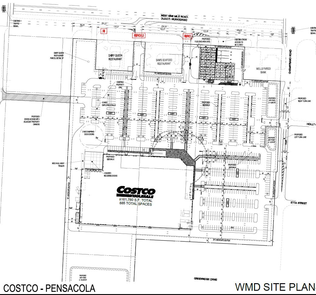 The plans filed with Escambia County show the 161,780 square foot Costco retail store with a gas station and 885 parking spaces at 235 East Nine Mile Road, at the corner of East Nine Mile Road and Chemstrand Road. That’s the site of a current Planet Fitness and a former Kmart store.
