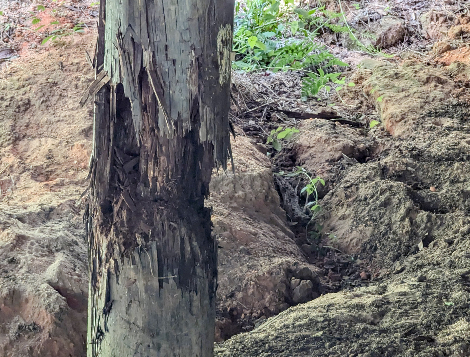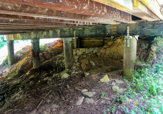 The Highway 168 bridge over Hobbs Branch, about three-quarters of a mile east of Pine Barren Road near Bratt, was closed July 3 after it failed a state inspection. When NorthEscambia.com photographed the bridge late shortly after the closure, it was obvious that at least one wooden support was extremely deteriorated and almost completely broken in two.