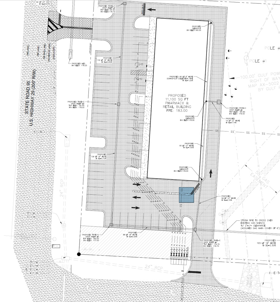 At 11,100 square feet, the pharmacy and retail building will be located at the northeast corner of Highway 29 and Molino Road, which is across Highway 29 from their current location and just south of a Florida Power & Light substation.