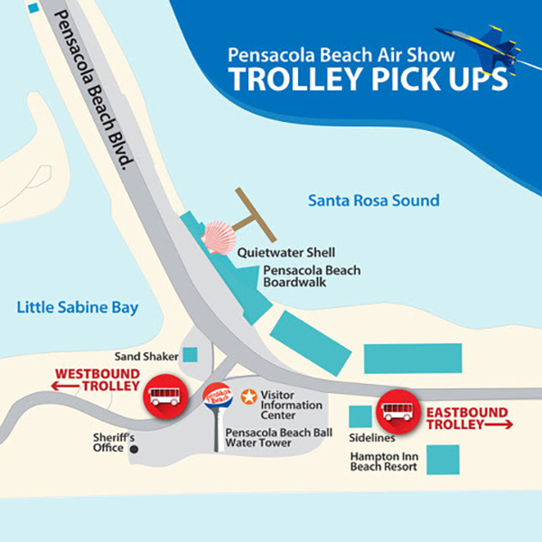 Post air show, trolleys servicing Portofino Resort/Park East will be staged on Via de Luna in front of Sideline’s Sports Bar and the Hampton Inn (facing east). Trolleys servicing Park West will be staged on Fort Pickens Road in front of the Surf & Sand Hotel and The Sandshaker (facing west).