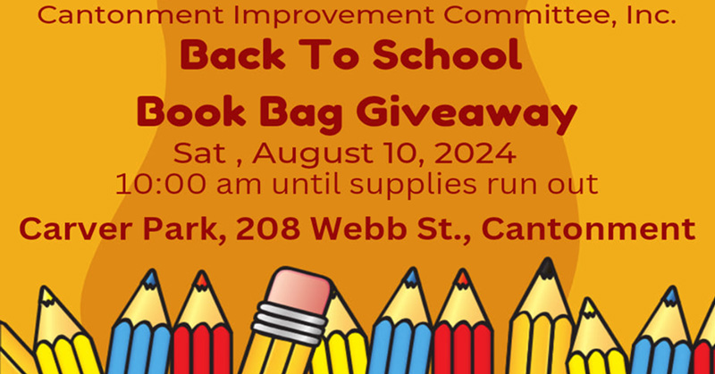 The Cantonment Improvement Committee will host a book bag giveaway this Saturday.