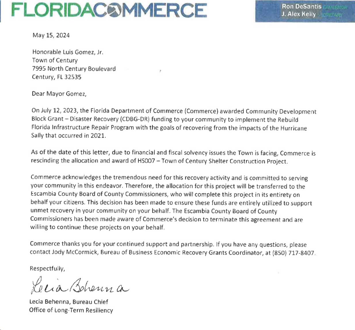“If Escambia County could move forward, this project would serve low to moderate-income individuals in a rural community and benefit not only Town of Century residents but also Escambia County residents,” Brown wrote. “We are excited about the opportunity to work with the Florida Commerce on this important initiative. We would be happy to report to the citizens that the project will still take place but will be administered by Escambia County.”