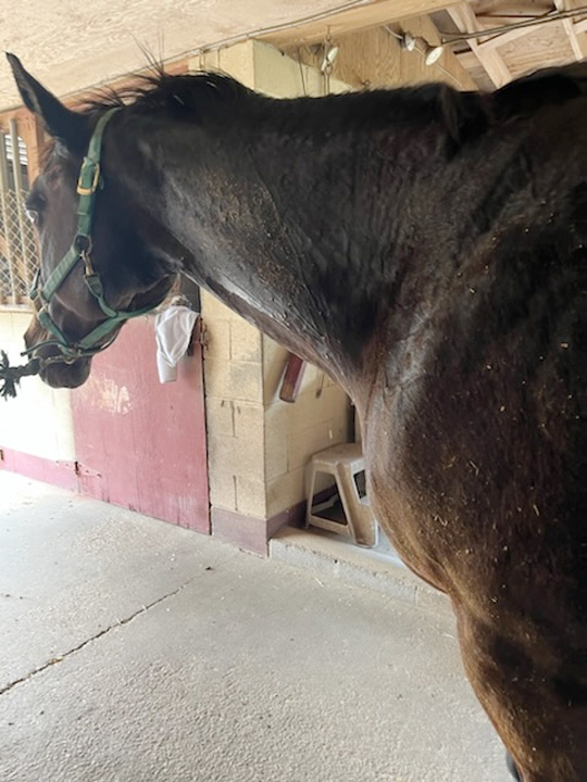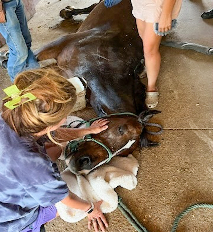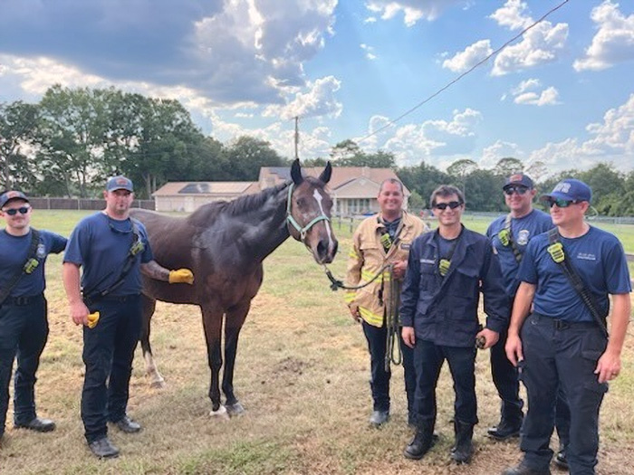 The incident occurred at approximately 2:37 p.m. in the 9800 block of Heather Drive. Upon arrival, firefighters found a 1,400-pound horse, named Raleigh, lying on his side, wedged against a wall and unable to move.