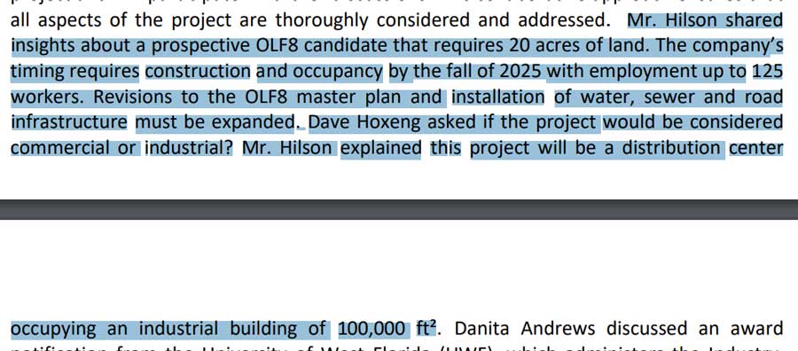 According to minutes from a June 25 Pensacola-Escambia Promotion and Development Commission (PEDC) meeting, then-FloridaWest CEO Brian Hilson explained this project will be a distribution center occupying an industrial building of 100,000 square feet.