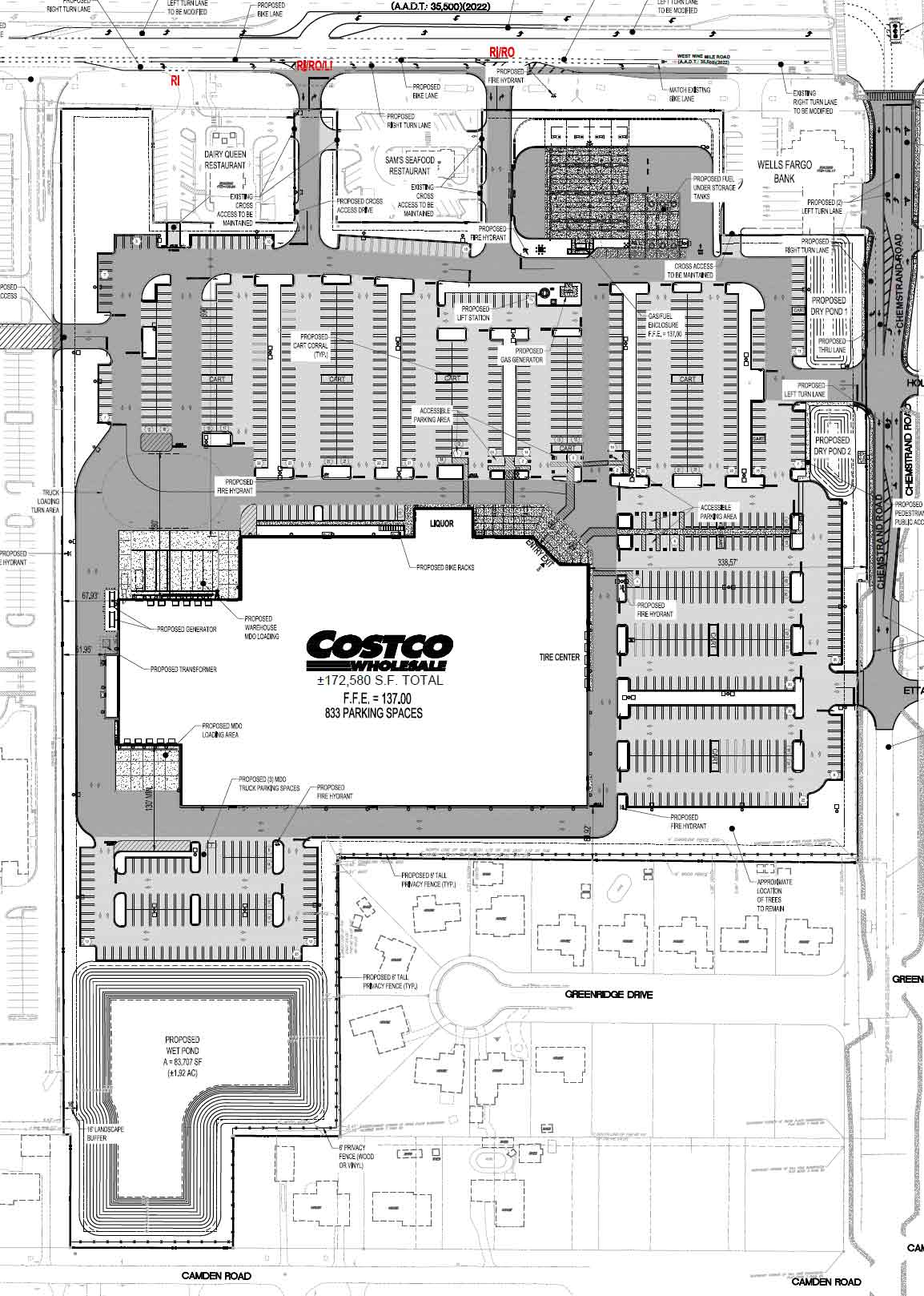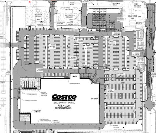 The plans show the existing Dairy Queen, Sam’s Seafood Restaurant and Wells Fargo to remain, with a Costco gas station constructed between Sam’s Seafood and Wells Fargo in an area that is currently a parking area for the old shopping center. The current Planet Fitness building will be demolished to make room for the new Costco.
