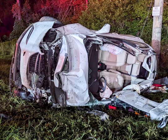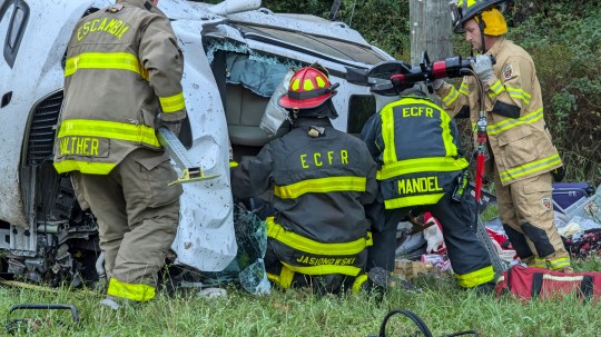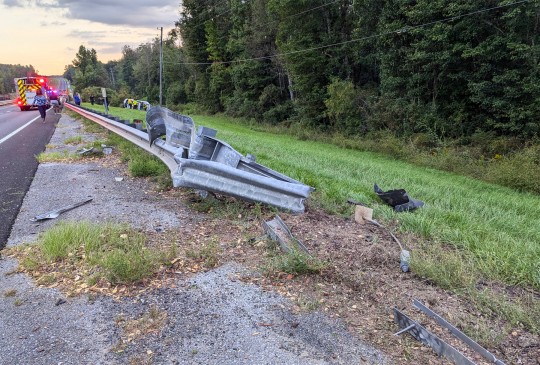 The woman was southbound when she lost control, struck a guardrail, and overturned in the ditch near a bridge over Pine Barren Creek. It took firefighters about an hour to free the trapped woman from the vehicle using the Jaws of Life and other extrication equipment.
