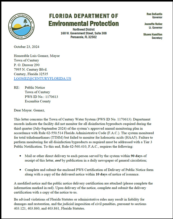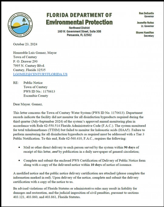 The Florida Department of Environmental Protection (DEP) said the Town of Century water system failed to properly monitor for disinfection byproducts as required over a three-month period.