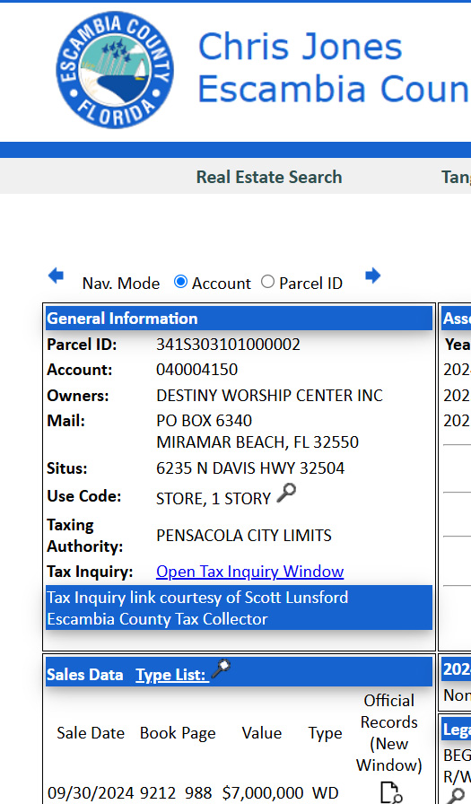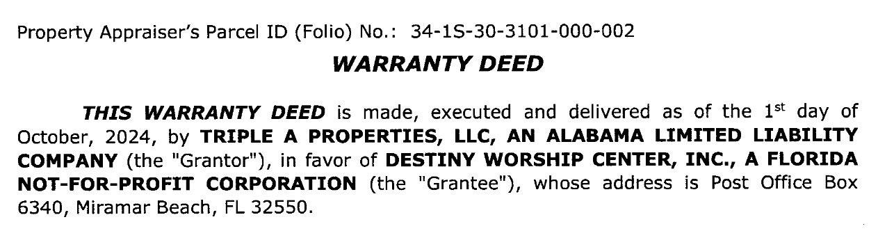 The Escambia County Property Appraiser’s website confirms the sale, and the deed (pictured below) also confirms the transaction.