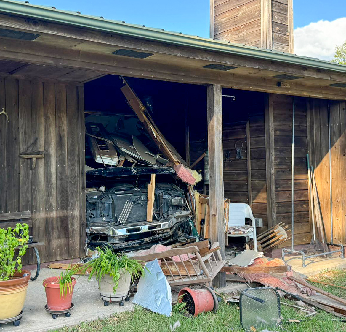 Wow! Just how fast was he going? Aside from the long distance to the home, he didn’t just crash INTO thee home, he crashed THROUGH it!