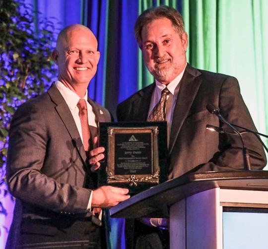 Pictured: Jerry Davis (right) was awarded the 2024 Distinguished Service Award by Florida Farm Bureau President Jeb S. Smith at the organization’s state annual meeting. Photo for NorthEscambia.com, click to enlarge.