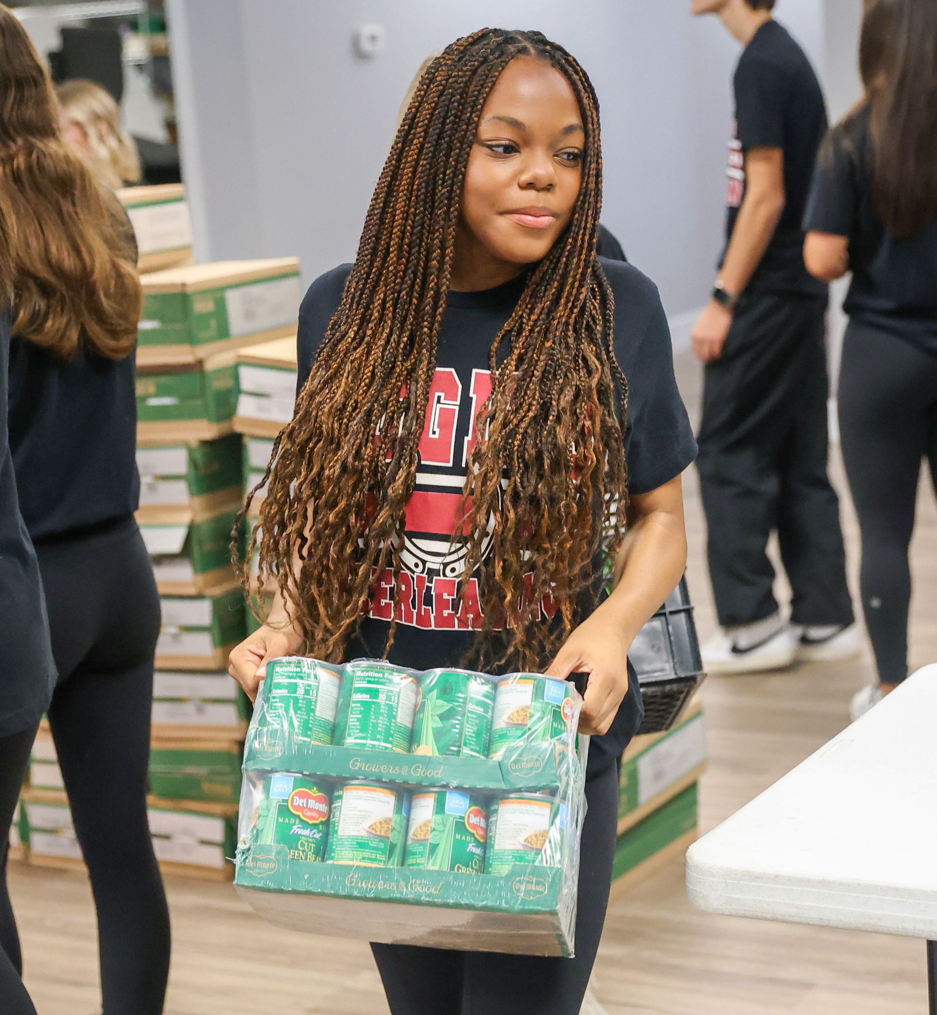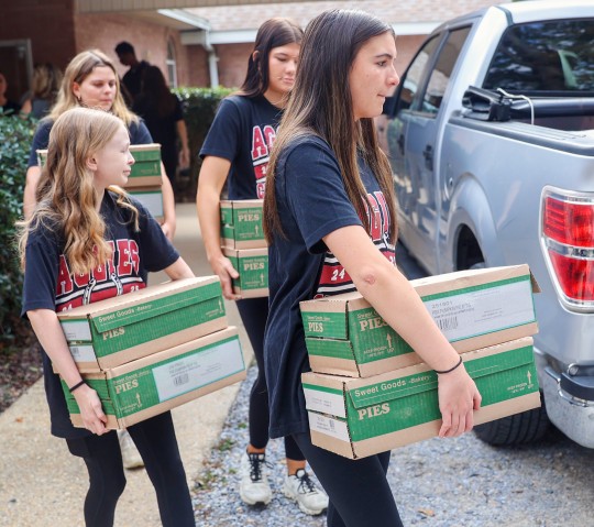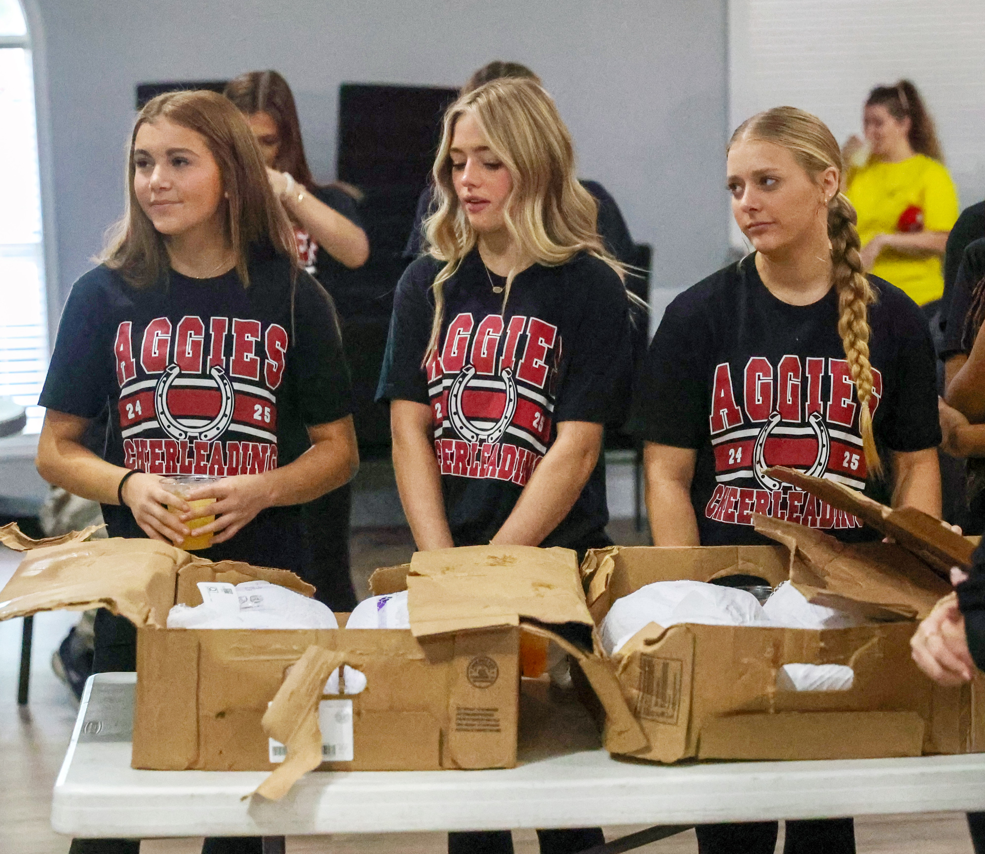 The Tate High School cheerleaders volunteered Wednesday at St. Luke United Methodist Church to help package the meals for delivery.
