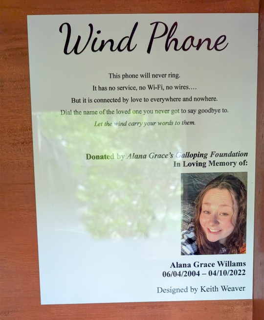 I have a wind phone in my backyard in Cantonment. After a good friend passed, my husband put a wall phone in our backyard over a bench so I could still talk to her. It’s since been used to talk to my dad, who passed a year and a half ago.